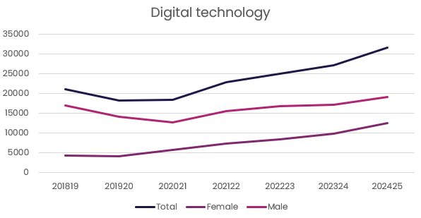 - Digital technology is one of the fastest-growing apprenticeship areas, with over 31,000 starts in 2024 – 2025. This echoes the trends we’ve seen across both workforce and education data.