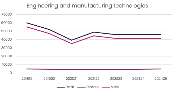 - Since 2018 – 2019, we have seen a 23% decrease in the number of engineering and manufacturing technologies apprenticeships being started. This is made up on a very small 3% increase in female starts, but a huge 25% decrease in male starts.