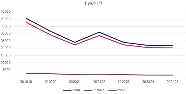 - Lower-level apprenticeships (Level 2) continue their long-term decline and remain dominated by male participation.
