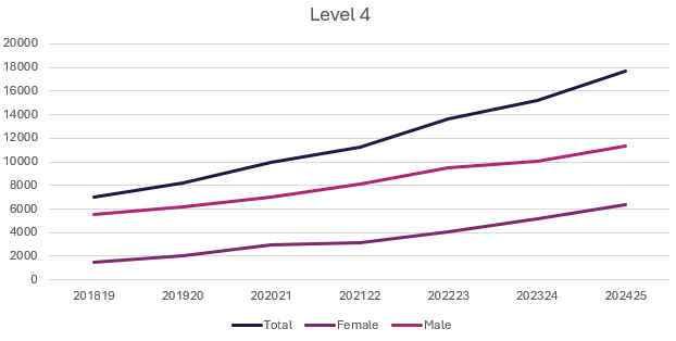 - Level 4 STEM apprenticeships continue to rise in popularity with 17,730 being started in 2024 – 2025.