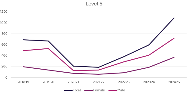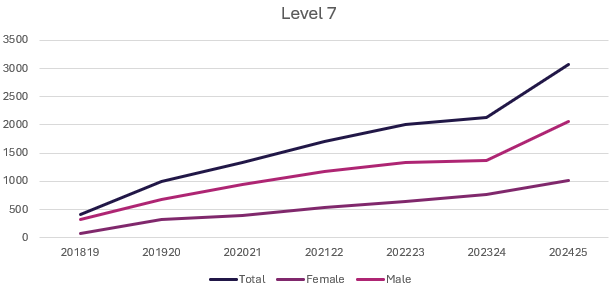- Level 7 apprenticeships (Master’s degree level) have seen a huge increase in popularity since 2018-19, with 3,080 being taken in 2024 – 2025.