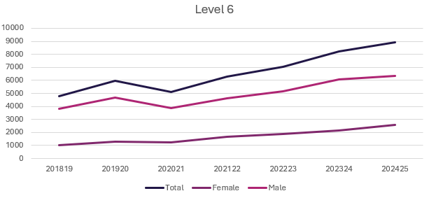 - Level 6 apprenticeships (degree level) have 8,910 starts in 2024 – 2025, with 29% of these being female (2,570 compared to 6,340 male).