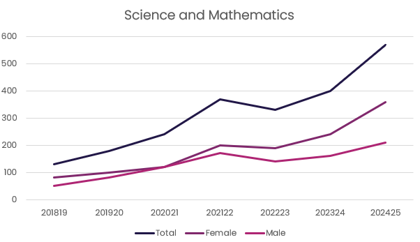 - There are significantly lower numbers taking up science and mathematics apprenticeships, despite a 338% increase of total starts since 2018 – 2019 (130 to 570).