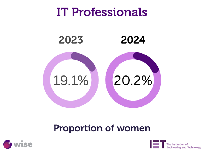 The proportion of women IT professionals has increased slightly to 20.2% with a rWithin the category of IT professionals, the grouping with the highest proportion of women is IT project managers (34.9%) and the lowest IT network professionals (4.9%).
