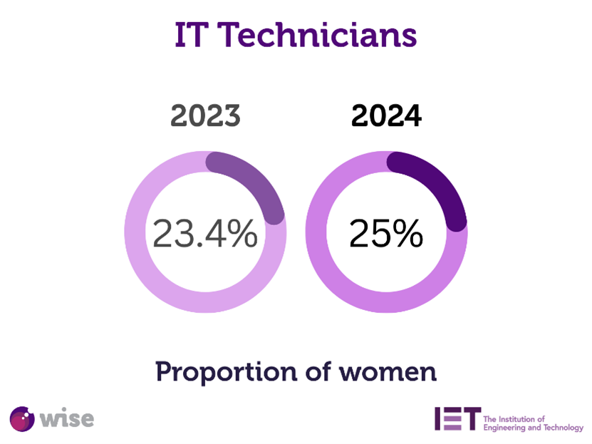 The proportion of women IT technicians currently sits at 25%, up from 23.4% in December 2023. Database administrators and web content technicians have the highest proportion of women at 38.6%, with computer system and equipment installers and servicers the lowest, at just 2.9%.