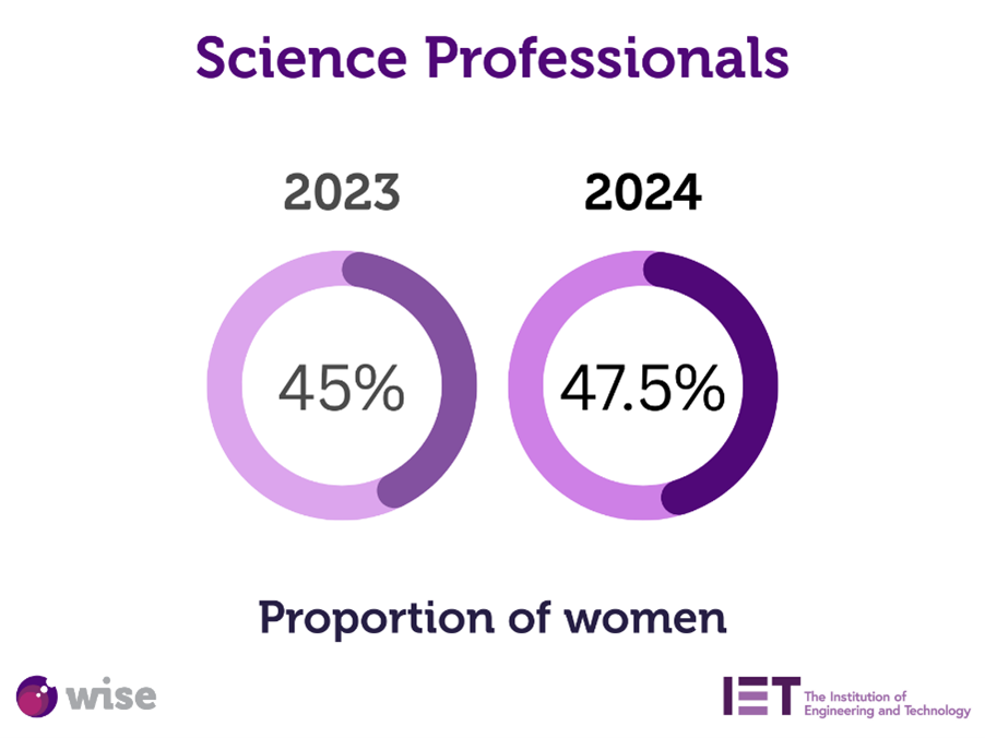 The proportion of women science professionals remains stable at 47.5%, the highest across the STEM fields. Over the past 17 years this has consistently been between 40 and 50% . There are now over 85,000 women science professionals.